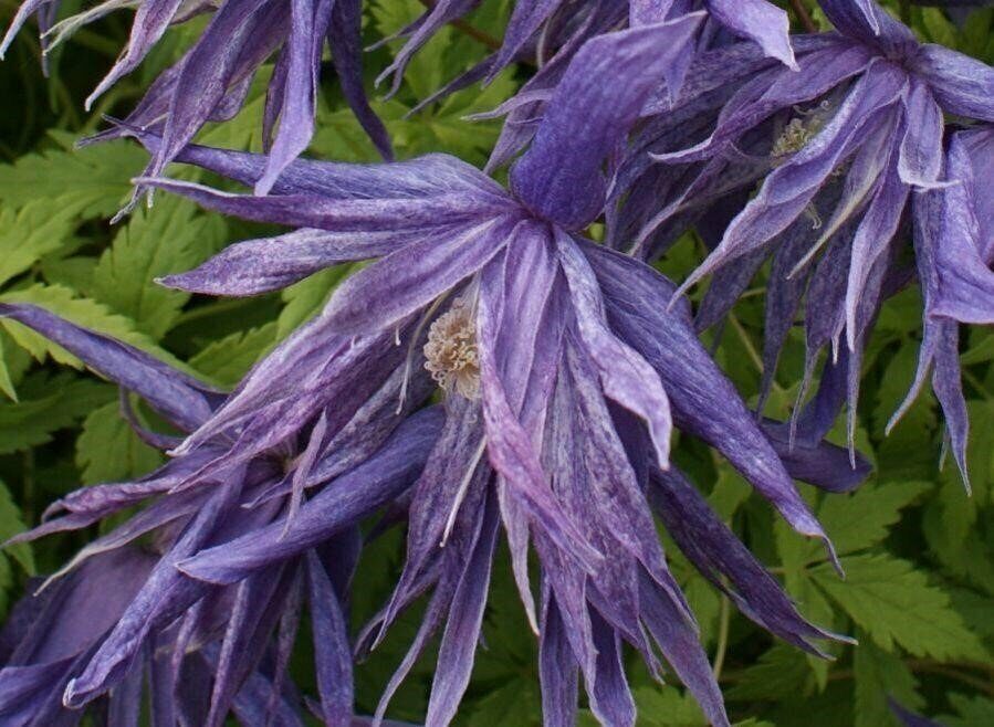 Интригующий новый польский сорт всегда махровыми, тёмно-фиолетовыми, колокольчатыми цветками! Цветки среднего размера (крупные для группы Atragene), диаметром 8-10 см, махровые, тёмно-фиолетовые, с серым оттенком, колокольчатые. Они состоят из 4 слегка волнистых заостренных чашелистиков. Тычинки зеленоватые. Наиболее обильно цветет в мае-июне, повторяют менее обильное цветение от половины июля до половины сентября. Лиана высотой 2,5-3 м, за опоры цепляется листовыми хвостиками. В обрезке не нуждается (I группа).