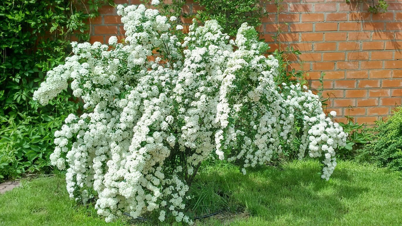 Раскидистый, широкий, сильно-растущий кустарник. Листья темно-зеленые. Цветки белые в густых соцветиях, полностью покрывают прошлогодние побеги. Красиво и обильно цветет. Морозоустойчив.