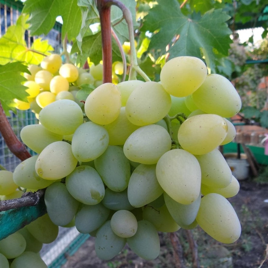 Отличительная особенность сорта — крупные ягоды яйцевидной формы весом 15–25 г (отдельные экземпляры достигают 30 г). Ягоды жёлто-зелёного цвета, на солнце приобретают янтарный оттенок с лёгким загаром. Мякоть мясисто-сочная с хрустящей съедаемой кожицей. Вкус гармоничный, сбалансированный, при полном созревании проявляется лёгкий мускатный аромат. Грозди крупные, конической или цилиндроконической формы, весом 500–700 г, при хорошем уходе могут достигать 1–2 кг. Кусты сильнорослые с хорошим вызреванием побегов. Цветки обоеполые, что обеспечивает самоопыление. Сорт обладает повышенной устойчивостью к милдью, оидиуму и серой гнили, морозостойкость — до -25°C