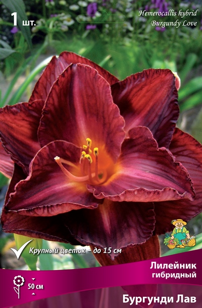 Бургунди Лав - высота растения 50 см, цветок темно-красный с зеленым горлом, крупный, махровый. Цветение июнь-июль.