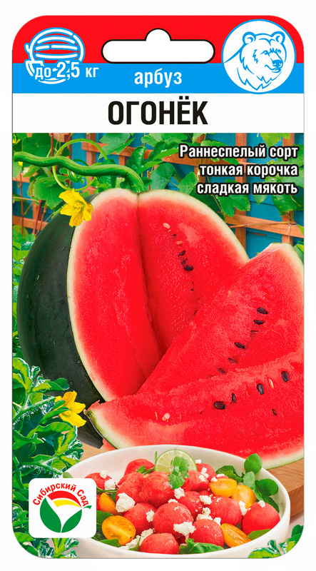 Скороспелый (70-80 до первого сбора) легендарный сорт порционного арбуза массой до 2,5кг. Районирован от Центрально-Черноземного до Восточно-Сибирского и Дальневосточного регионов. Один из лучших проверенных сортов для Сибири и Урала. Неприхотлив к непогоде и в уходе, прекрасно растет в отрытом грунте на приусадебных участках. Растение короткоплетистое (до 1,8м). Плоды шаровидные, массой 1,7-2,3 кг. Кора тонкая, черно-зеленой окраски со скрытым рисунком. Мякоть оранжево-красная, нежная, сочная, сладкая со свежим легким ароматом. Сорт относительно устойчив к антракнозу, слабо поражается мучнистой росой. Товарная урожайность до Зкг/м2.