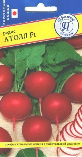 Новый среднеранний гибрид редиса. Вегетационный период составляет 23-25 дней от появления всходов. Гибрид хорошо адаптируется к различным условиям выращивания. Подходит для всесезонного выращивания. Листья прямостоячие размером до 10-12см. Корнеплоды округло-плоской формы, с тонким хвостом, окраска шейки и коры красного цвета, диаметр 3,5 cм. Мякоть белого цвета, отличного качества, в сердцевине не образуется пустота. Атолл F1 характеризуется высокой урожайностью стандартных корнеплодов и устойчивостью к стрелкованию. Пре